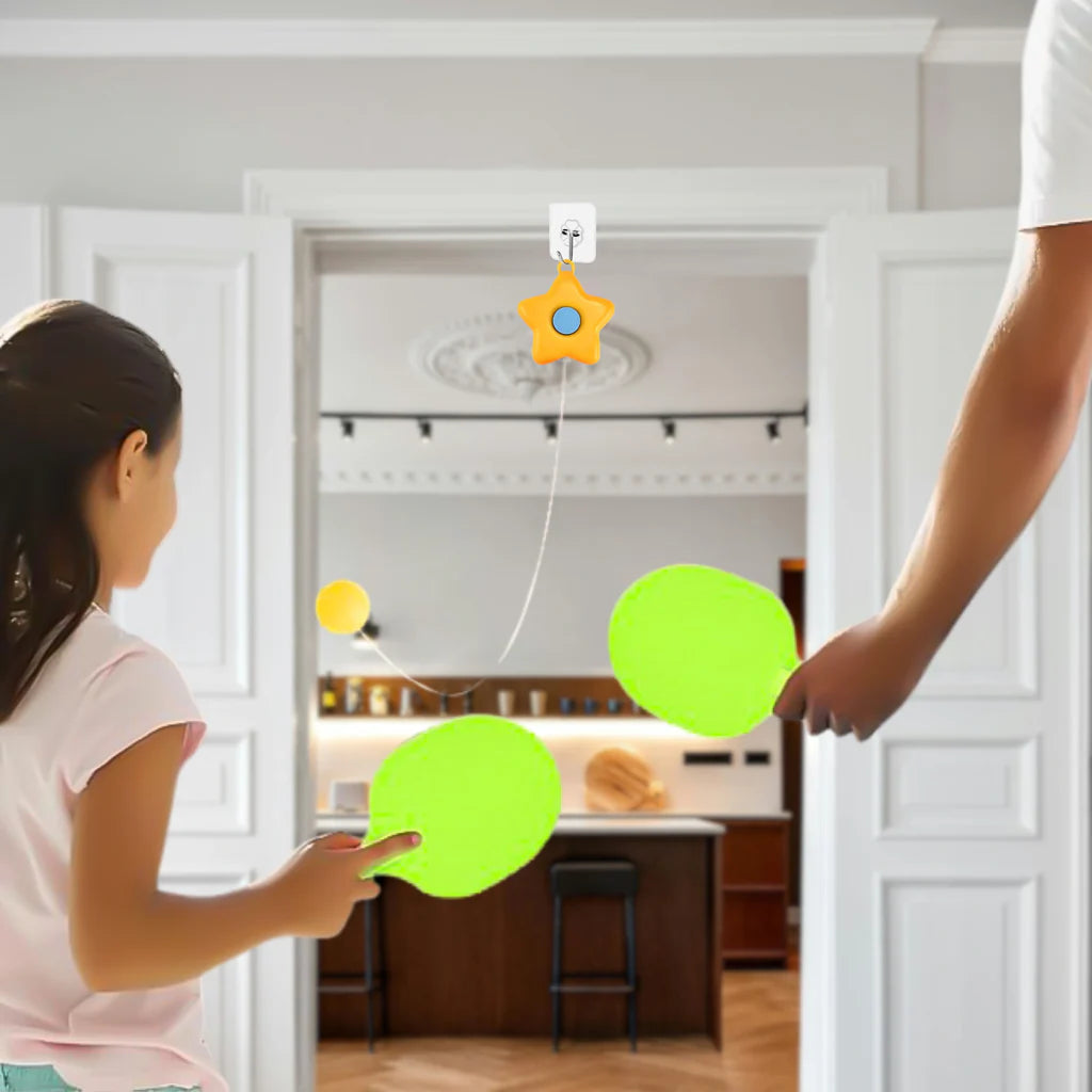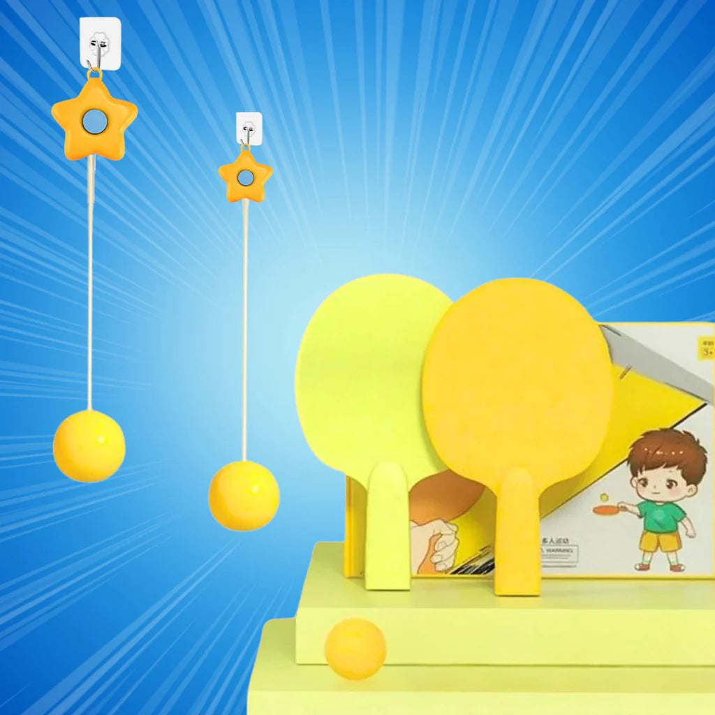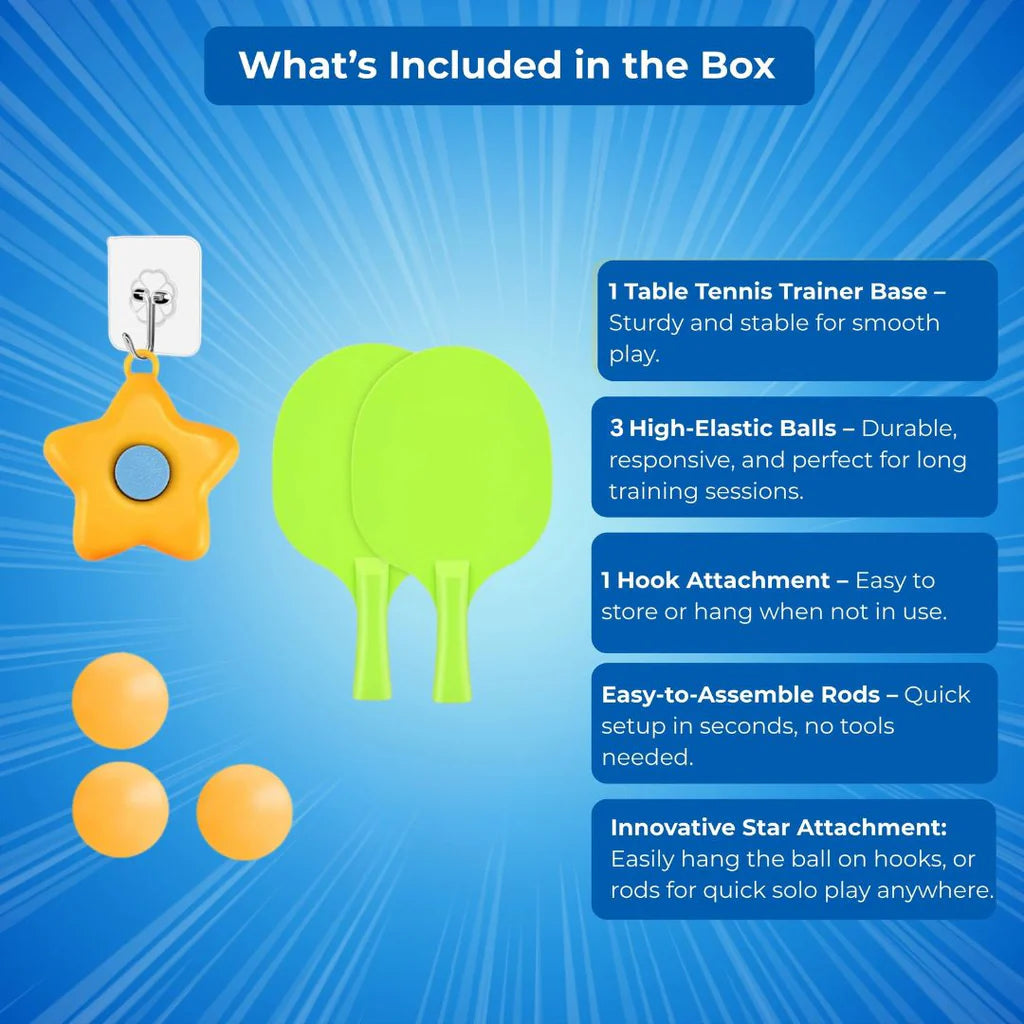What’s Inside the Box- Includes 1 trainer base, 2 paddles, 3 bouncy balls, hook & star hanger, and rods—everything you need for instant solo ping pong fun!