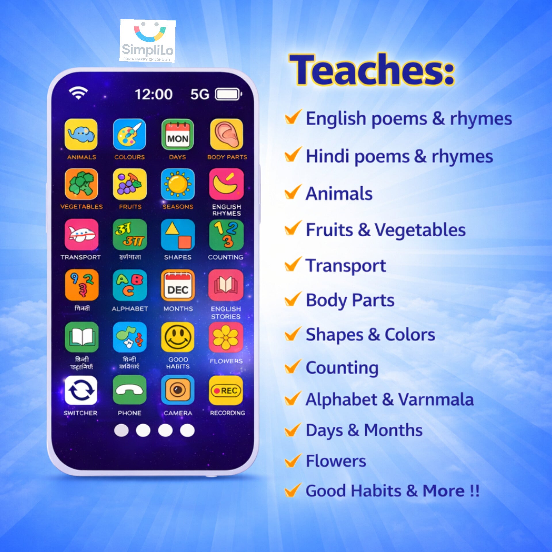 š Speaks 10 Languages: Helps kids learn and listen in 10 regional languages using a dedicated language switcher button. Once selected, the phone speaks only that language, making learning focused and effective.